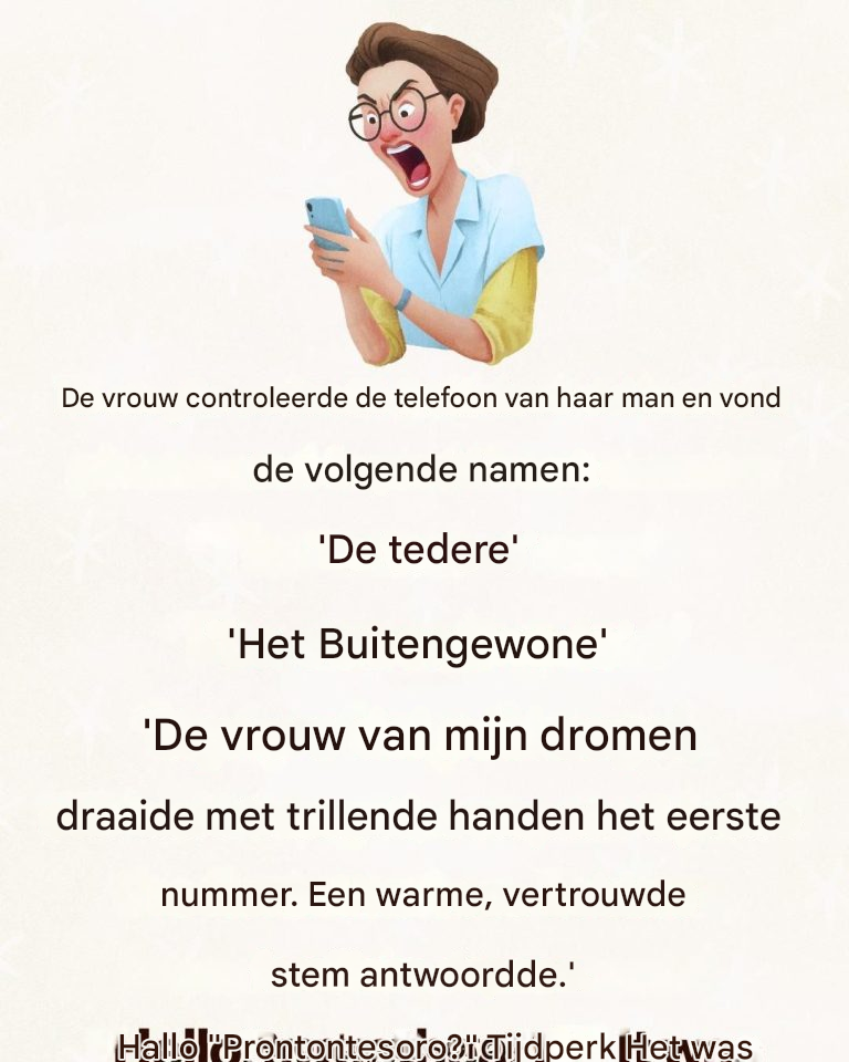 Haar man was op de bank in slaap gevallen, zijn telefoon trilde zachtjes naast zijn hand. Een berichtvoorbeeld lichtte even op het scherm op, net lang genoeg om een naam te zien die haar hart sneller deed kloppen.