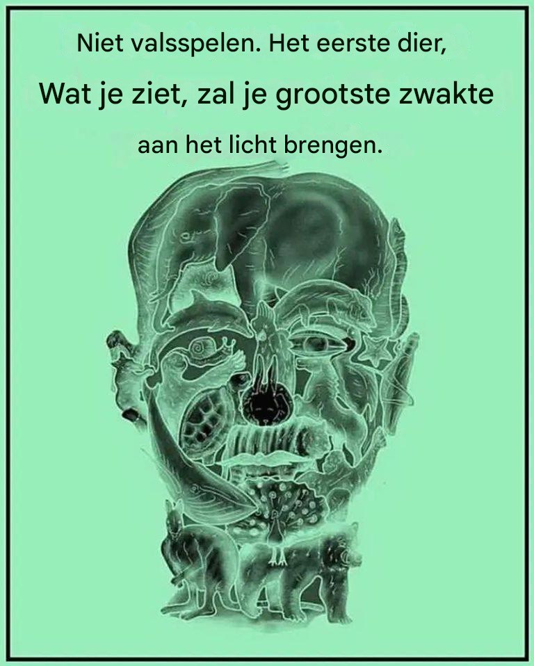 Een foto met veel verborgen dieren circuleert voortdurend op sociale media, vergezeld van de slogan: "Niet valsspelen. Het eerste dier dat je ziet, zal je grootste gebrek onthullen." Het is een illustratie die op het eerste gezicht lijkt op de omtrek van een menselijk gezicht, maar die verschillende over elkaar geplaatste silhouetten van dieren verbergt. Dit type visuele test is erg populair geworden omdat het nieuwsgierigheid en discussie oproept over de vraag of ze daadwerkelijk de persoonlijkheidskenmerken van de persoon die ze bekijkt weerspiegelen.
